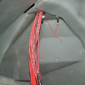 When  you have all of them done you will see a lot of wire coming through the hole like this: (for reference the 1 points to the bolts that hold down the computer cover..
