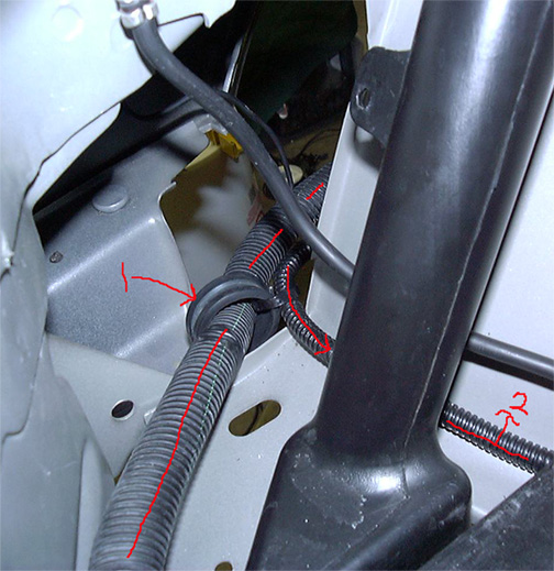 Since we were the first to do this we erred on the side of caution and made the loom much longer than need (2 feet).. So I had to mount the excess wire in the top of the fender.  #2 marks the taped up wire loom (note wire clamp used).  #1 is the infamous vacuum hose.  You should only have to extend the wires 15”’s tops so your mounting may vary.