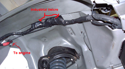 Here is a picture of entire loom attached to the top inside of the fender.  I used industrial Velcro to hold it all in place.. It’s a tight fit but the wheel well went back in fine and now it all looks very clean inside.
